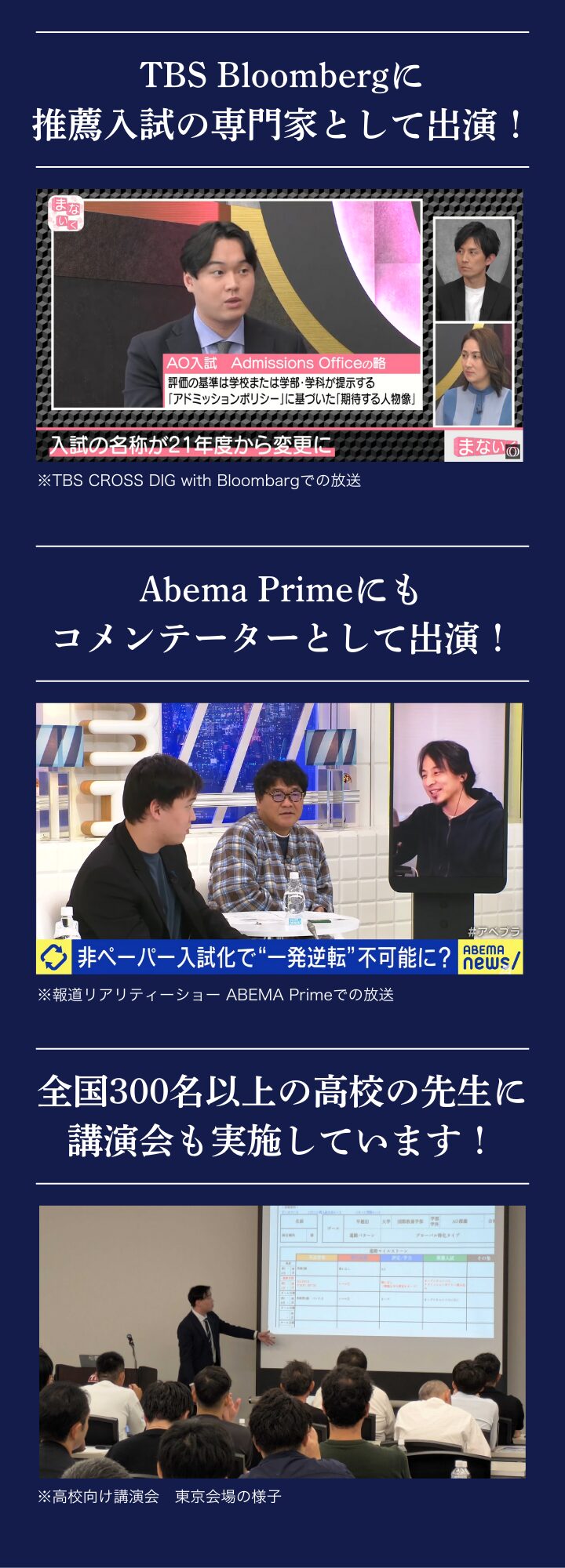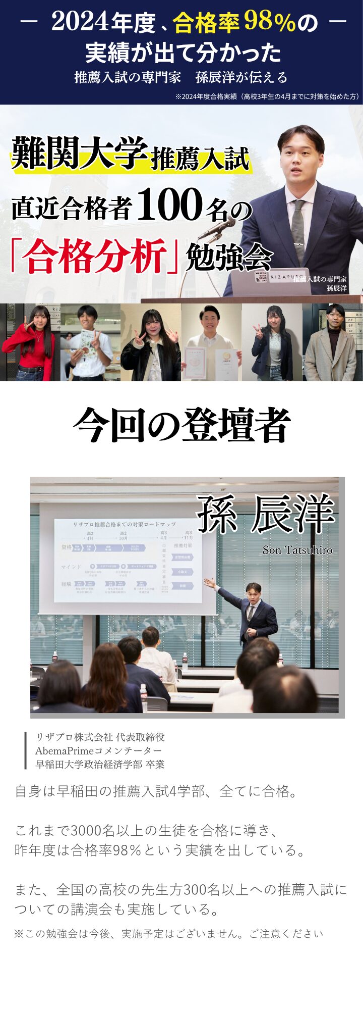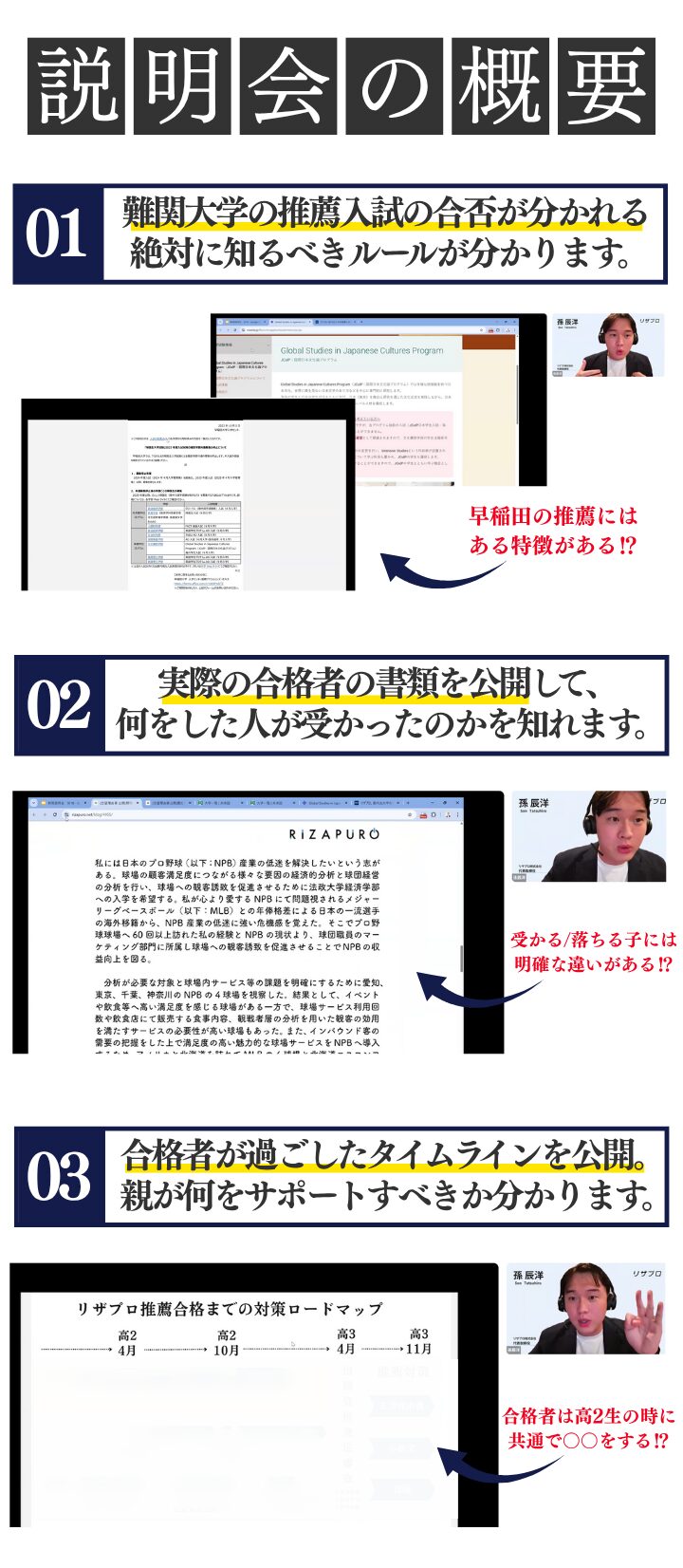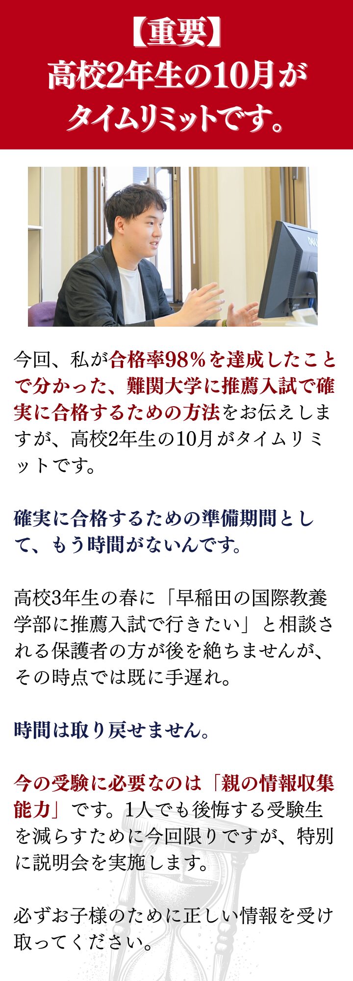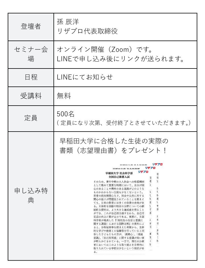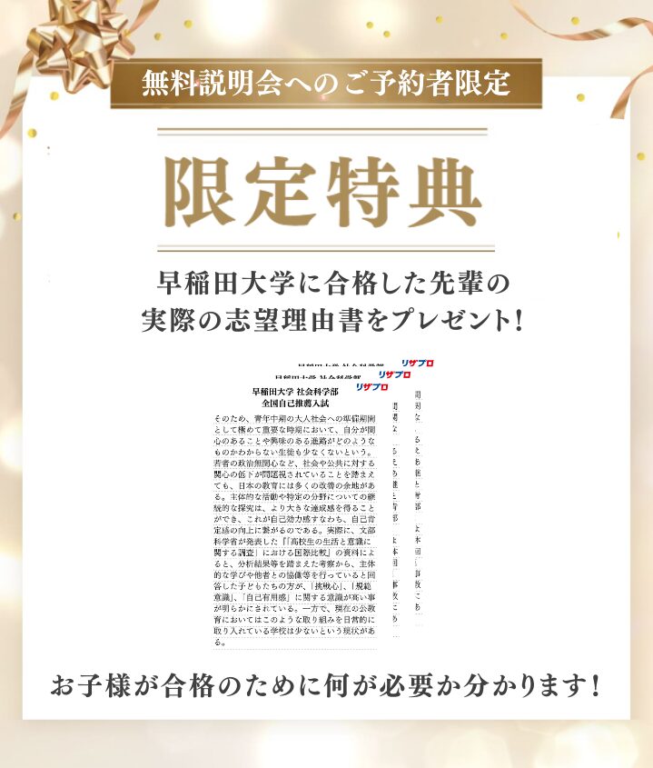 A. 受験を見据えて大学入試の最新の傾向を抑えておきたい保護者様が多いです。特に高校2年生の保護者様が多くいらっしゃいますが、高校1年生や中学生の保護者様にも良い情報を得て頂く内容になっておりますので、ご安心ください。