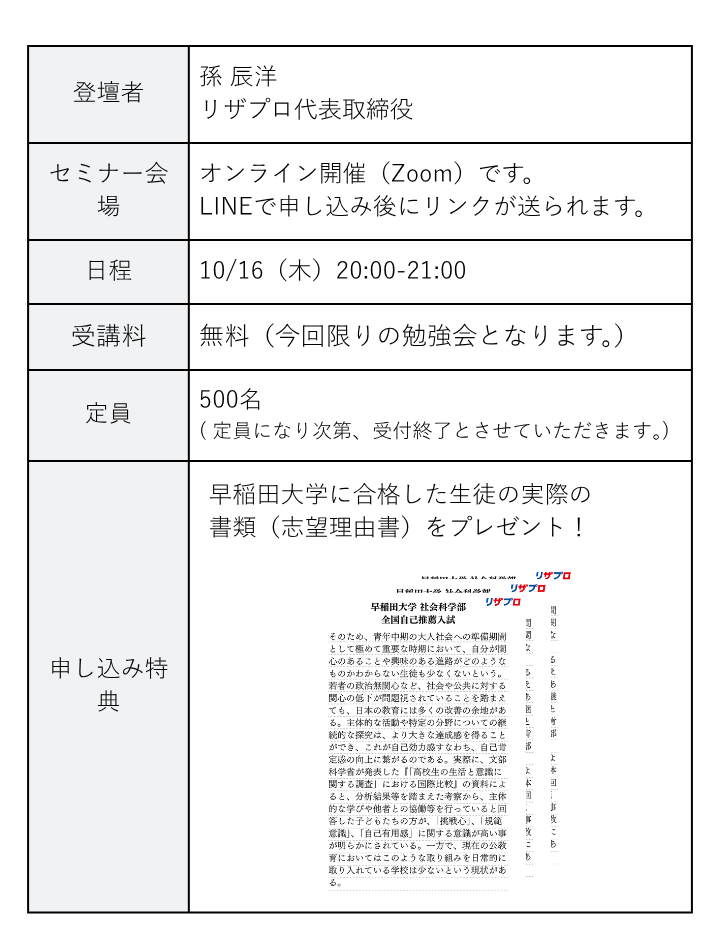 A. 受験を見据えて大学入試の最新の傾向を抑えておきたい保護者様が多いです。特に高校2年生の保護者様が多くいらっしゃいますが、高校1年生や中学生の保護者様にも良い情報を得て頂く内容になっておりますので、ご安心ください。