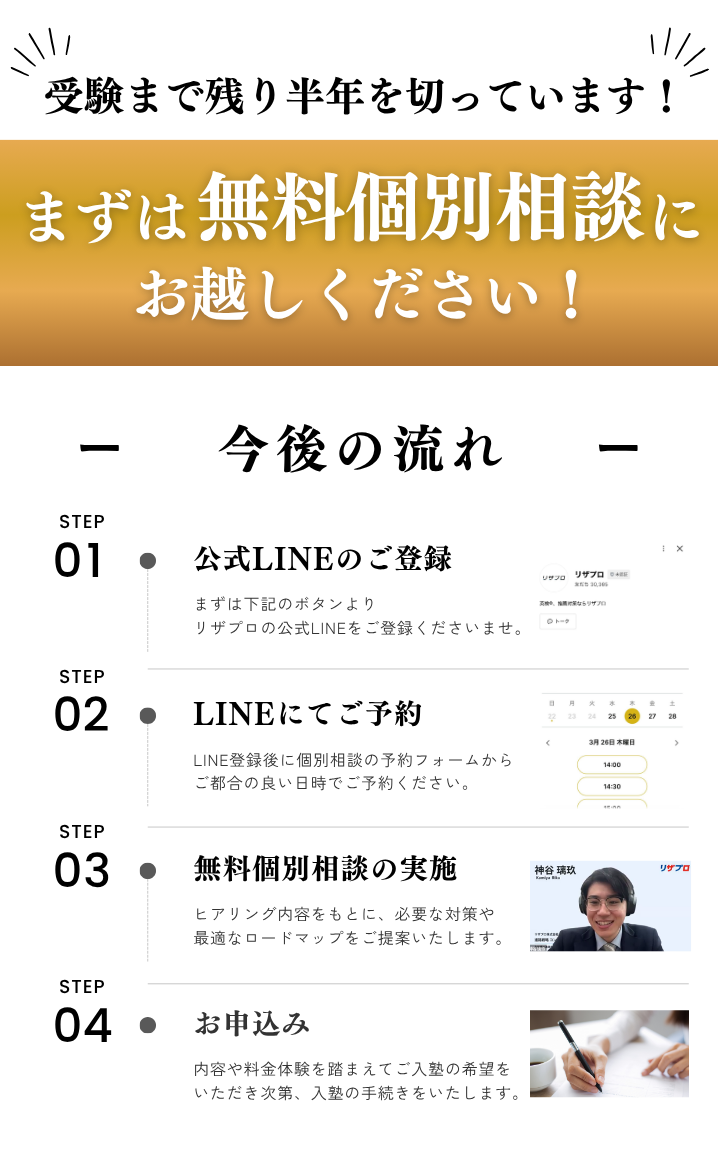 A. コースや期間によって異なります。面談の中で状況に合ったプランをご説明しますので、まずはお気軽にご参加ください。